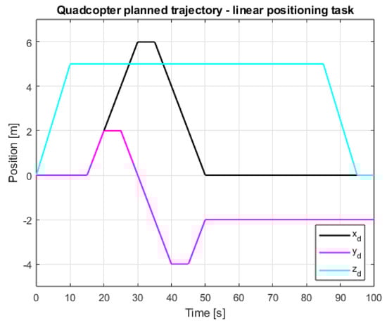 The quadrotor aircraft belongs to the category of Unmanned Aerial Vehicles (UAVs), commonly referred to as drones []. The growing popularity of these devices in professional applications has contributed to intensive technological development. The requirements for the quality of drone performance are constantly being expanded, especially those related to increasing their resistance to interference caused by changes in wind direction, strong gusts caused by explosions and contact with obstacles. This can be even more visible in linear positioning tasks, where the stability and precision of the position adjustment are particularly important. Currently, more and more often, as in many other disciplines that require complex control algorithms or where regulation processes are difficult to implement, attempts are being made to use artificial intelligence methods. Artificial intelligence algorithms work very well for controlling both a single UAV and entire formations of drones, where interference is caused not only by changeable external conditions (e.g., wind) but also by communication disturbances [,,]. However, it is possible to achieve good results in the classical way. One of the promising directions in the development of drone control techniques is the use of sliding mode control (SMC) methods, which give much better results than classic methods based on PID controllers [,,,,,,,,]. This work required the development of a mathematical model of a quadrotor, which is a rather complicated and strongly nonlinear object, and conducting simulation studies enabling the synthesis of appropriate control systems. As part of the work, two types of control systems (linear and nonlinear) for drone positioning were designed to allow for testing their operation in the aforementioned simulation environment. First, the system was adapted to control angular positions, which is necessary for the further construction of a cascade system with master linear positioning controllers. For both outer and inner control loops, the performances of two mentioned methods (PID and SMC) were compared. Studies of the operation of selected control methods allowed for obtaining information about the quality of control, the impact of disturbances on the operation of the system and the impact of partial unawareness of the system parameters or their inaccuracy. The most important aspect of this work is the comparative analysis of classical control methods with sliding mode control algorithms, especially due to the presence of the abovementioned difficulties and those implemented within the modeled system. The target sliding mode control system proposed in this study pertains to a cascaded structure of sliding mode controllers that closely cooperate based on the principle defined by the binding two-stage equivalent control law. One of the primary requirements for this controller was the ability to mitigate the phenomenon known as chattering, which is a typical issue encountered in traditional sliding mode control approaches.