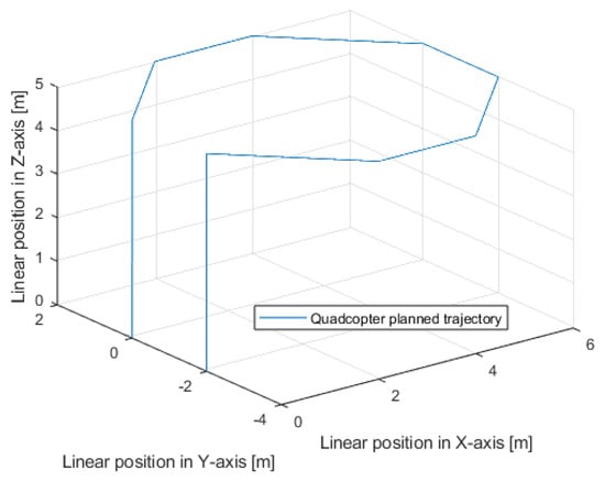 A quadrotor is an object with complex dynamics, characterized by strong nonlinearity, the impact of which is particularly evident as the drone’s speed increases [,,,,,,,,]. The design of the control systems of a quadrotor should take into account that it is an object with six degrees of freedom (DOF), which are represented by three axes of linear motion and three Euler angles. The object has four control quantities, which are successive lifting forces of the individual rotors [,,,,,,,].