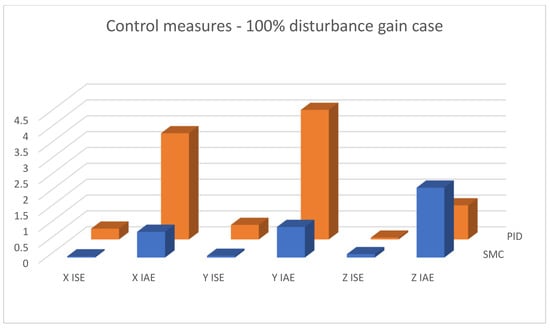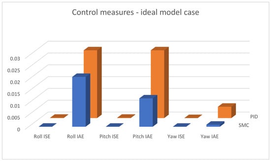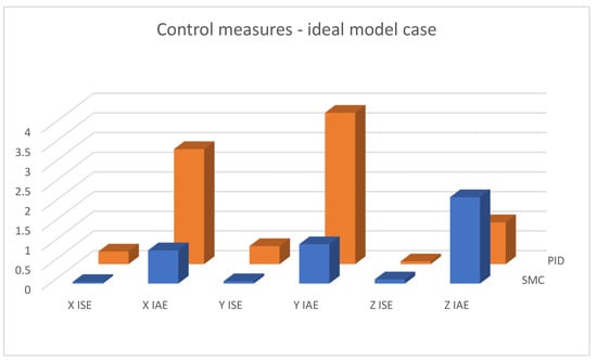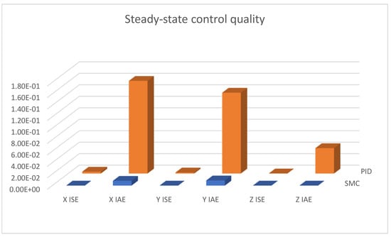 Figure 19, Figure 20 and Figure 21 shows linear positioning control system performance based on calculated control measures logged during simulation tests. It is clearly visible that the proposed sliding mode control algorithm allows for obtaining much better results in the case of X and Y linear position value control. However, the analysis of quality measures shows that the results for altitude control are visibly, although slightly, better for the case of classical PID controllers. This is due to the fact that the equivalent control of the altitude controller is also used as a component of the equivalent control of the X and Y linear position controllers; this causes the work of the algorithms to influence each other, which is visible in the form of small overshoots in dynamic states.