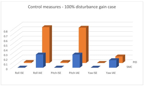 Bar charts presenting collected control measures—angular positioning case; disturbance applied (100% gain).