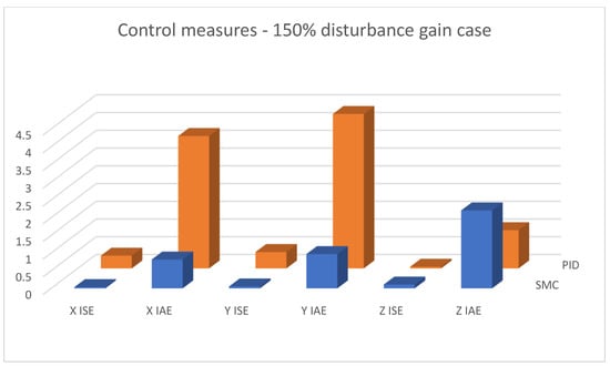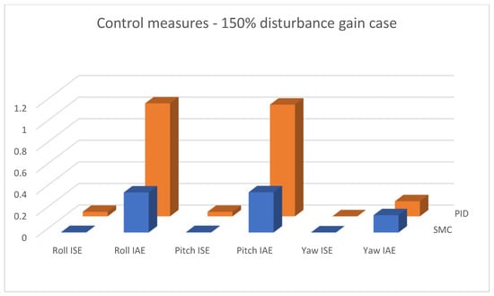 Bar charts presenting collected control measures—angular positioning case; disturbance applied (150% gain).