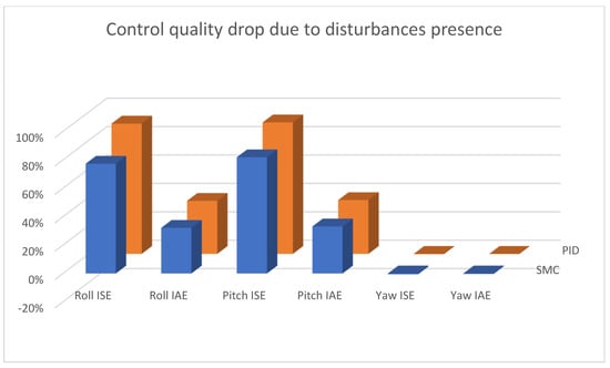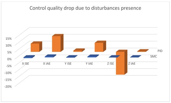 In Figure 22, one can see that the quality control does not deteriorate in any significant way in the case of sliding mode control, in contrast to PID control, for which the altitude control does not deteriorate either, but for X and Y linear position control, it becomes much less effective.