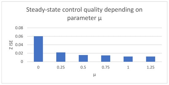 Table 3 shows the control measures collected for the steady-state case of the quadcopter altitude signal. Depending on the used value of the µ parameter, it is possible to obtain significantly different results; for µ = 0, a case with classic discontinuous control with constant amplitude was obtained. Increasing the µ parameter leads to a decrease in the influence of chattering on the system. A comparison is shown in Figure 24. The higher the µ value, the better the quality of the control in the steady state. The waveforms presenting the chattering occurring on the quadcopter altitude signal are presented below.
