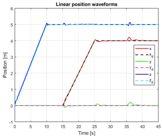 Finally, to check whether the introduced changes do not deprive the system of its robustness related to the Variable Structure System property, an additional experiment was conducted, the aim of which was to introduce a strong, extreme disturbance. This disturbance (signal waveform presented in Figure 28) is a modeled strong wind, the value of which changes almost abruptly, which is to imitate the situation of a quadcopter leaving a wind shield (e.g., flying out from behind a building wall). In Figure 29, quadcopter linear positions are shown. It is very visible that the introduced extreme disturbance affects the system, but does not cause its stability to be lost. The control system quickly brings the position values back to the correct steady state. There were small and momentary overshoots, which are completely acceptable in the event of this type of disturbance. The proposed method is therefore highly robust to interference and, at the same time, ensures a significant reduction in the impact of the chattering phenomenon.