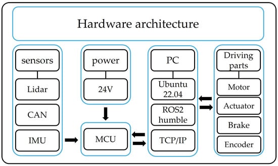Figure 2 shows the hardware architecture of the mobile robot used in this experiment. The robot, powered by a 24 V battery, is equipped with a LiDAR, camera, CAN BUS, and IMU as the primary sensors, which are connected to the MCU of the robot. The local PC facilitates sensor fusion between the driving components and MCU, acting as a data intermediary for various sensors. These data are utilized by the ROS2 internal algorithms to actuate the actuators and send feedback data back and forth.