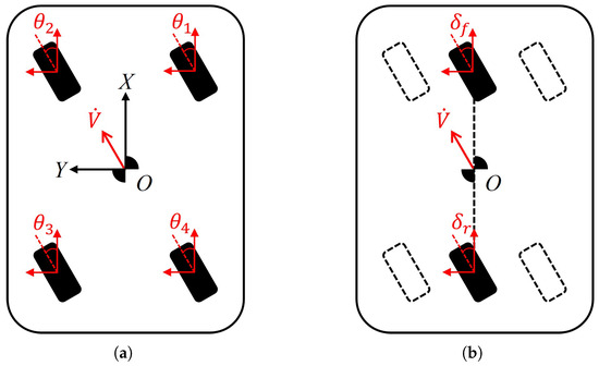 Figure 3a illustrates the parallel driving mode, one of the key steering strategies of 4WIS mobile robots. In Parallel mode, there is no rotational movement, which distinguishes it from other modes like Ackermann steering. Instead, only longitudinal (X-direction of the robot) and transverse (Y-direction of the robot) movements are involved, allowing for precise control in two dimensions. The most notable feature of this mode is that all four wheels steer in the same direction simultaneously. Given that the front and rear wheels are situated on the same horizontal plane, the motion vector of the mobile robot in Parallel mode can be derived through the application of the bicycle model [67]: