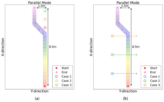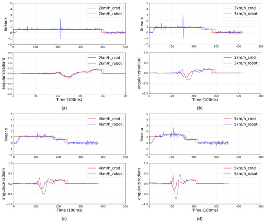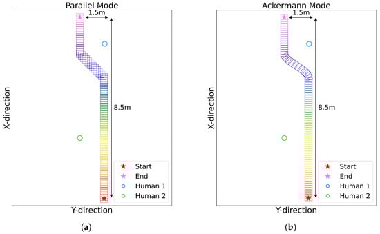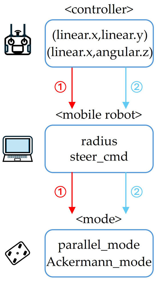 Figure 7 shows a flowchart of the control system for the mobile robot. The mobile robot accepts two command formats for velocity control: (, ) and (, ). The ROS2 internal algorithm on a local PC receives these data and is responsible for interpreting the command format, calculating the turning radius or steering angle, and switching the mobile robot to the appropriate driving mode. Previously, the driving mode was preset based on the signal format: if the signal included lateral movement (), the robot operated in Parallel mode; if it included rotational movement (), it switched to Ackermann driving mode.