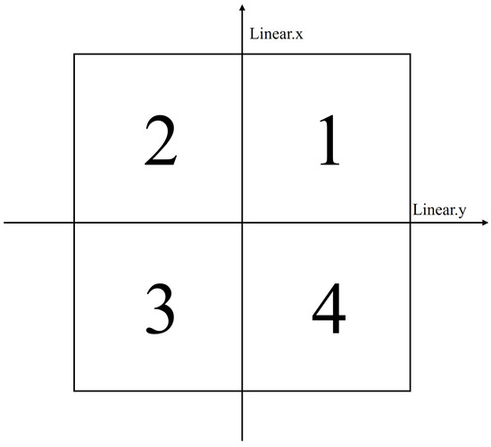 For example, if Linear.x > 0 and Linear.y > 0, the wheel is located in the first quadrant (1/4 quadrant). In this case, according to Table 1, the steering angle is positive (+), and the wheel direction is front. This means the wheel will be oriented towards the positive direction of the x-axis and y-axis and will rotate forward. Here, we can find that the direction of the wheel is determined by Linear.x and the steering angle is determined by Linear.y. Based on this relationship, we can rewrite Equation (3) using our control signal format as follows: