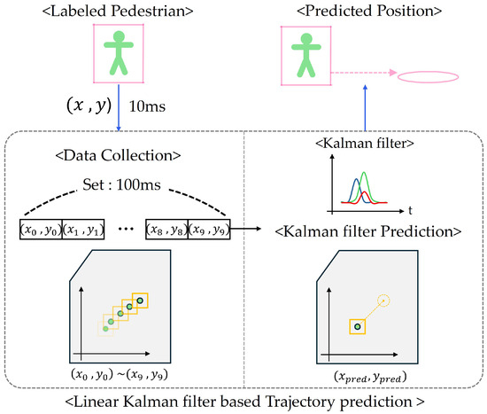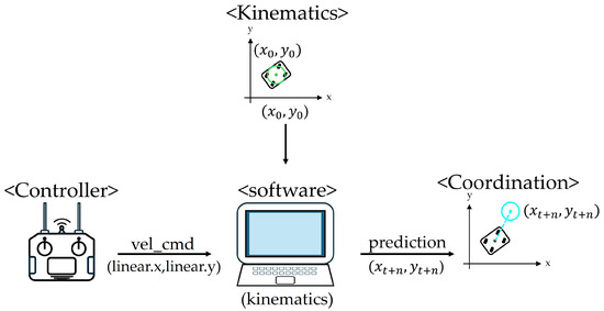 Figure 10 illustrates the overall structure of mobile robot trajectory prediction. The algorithm receives the velocity command sent from the controller in the form of (Linear.x, Linear.y) and uses the kinematic equations of the mobile robot to return the coordinates of the expected positions in a few seconds. It calculates this from the current position (, ) to the predicted center position of the robot.