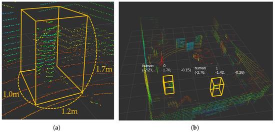 To enhance the accuracy of the recognition process, we predefine the range of human size parameters to filter potential human candidates [38,39] As shown in Figure 11a, these preset values for human detection are width 0.5∼1.0 m, length 1.0∼1.2 m, and height 1.5∼1.7 m. The point cloud data obtained from the LiDAR sensor are then clustered based on these parameters to detect people.