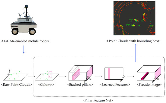 For detecting human objects (LiDAR-based 3D object) in point cloud data, we employ the Pillar Feature Net algorithm, as shown in Figure 12, which transforms irregular 3D LiDAR points into an organized grid structure through vertical discretization (pillars) [70,71]. The algorithm encodes point-wise features and spatial relationships within each pillar, converting the point cloud data into a pseudo-image format that can be efficiently processed by conventional 2D convolutional networks for real-time human detection.