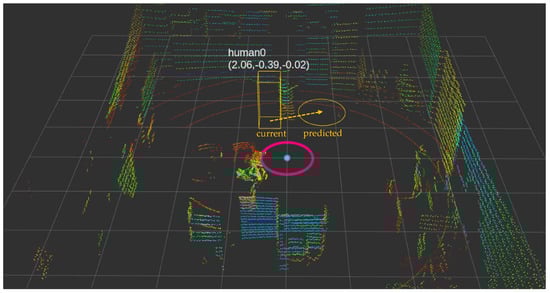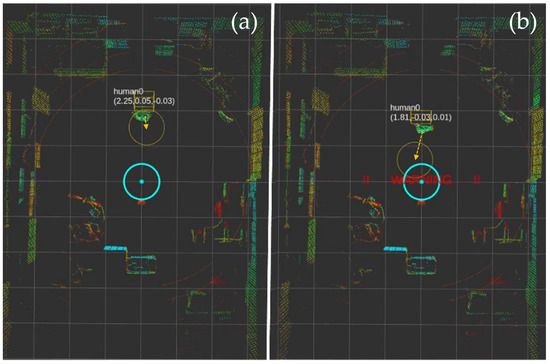 The LiDAR-based human detection system, demonstrated in Figure 11, operates within a 5 m radius from the robot’s center, providing optimal coverage for indoor environments. This specific distance is chosen as an optimal balance between safety and operational efficiency. It takes into account typical human walking speeds, the mobile robot’s maximum speed, and provides sufficient time for the robot to react and adjust its trajectory if needed.
