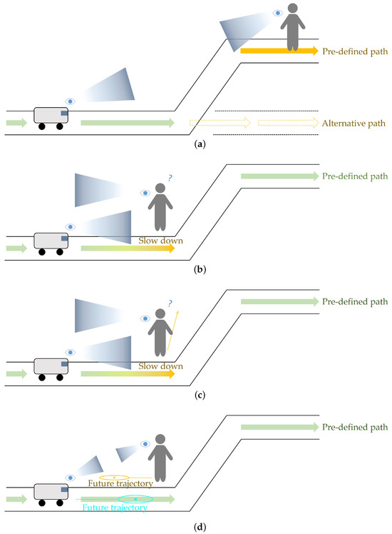 However, several limitations need to be addressed in future work. In contrast to outdoor environments, where vehicles interact with pedestrians using standardized traffic rules and indicators such as turn signals and tail lamps, mobile robots lack such conventional communication methods [56,57]. In indoor settings, the absence of standardized traffic rules further complicates the establishment of consistent behavioral guidelines. Our time-based approach offers a flexible solution for defining robot behavior based on the remaining time to potential collisions, but further refinement is necessary. Unpredictable human movement patterns in indoor spaces pose significant challenges for collision prediction [45,63]. Current models may require further refinement to accommodate diverse human behavioral patterns and complex scenarios. Developing more sophisticated and context-aware interaction models will be crucial for enhancing the system’s effectiveness in real-world applications.