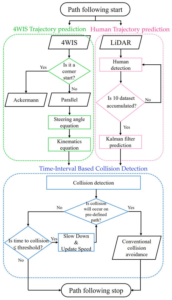 The recent growth in e-commerce has significantly increased the demand for indoor delivery solutions, highlighting challenges in last-mile delivery. This study presents a time-interval-based collision detection method for Four-Wheel Independent Steering (4WIS) mobile robots operating in human-shared indoor environments, where traditional path following algorithms often create unpredictable movements. By integrating kinematic-based robot trajectory calculation with LiDAR-based human detection and Kalman filter-based prediction, our system enables more natural robot–human interactions. Experimental results demonstrate that our parallel driving mode achieves superior human detection performance compared to conventional Ackermann steering, particularly during cornering and high-speed operations. The proposed method’s effectiveness is validated through comprehensive experiments in realistic indoor scenarios, showing its potential for improving the efficiency and safety of indoor autonomous navigation systems.