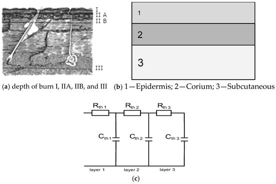 (a) Anatomy of the skin (from [10])—depth of burn; (b) three-layer structural model; (c) equivalent thermoelectric model [22].