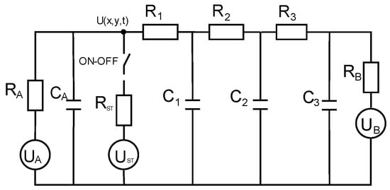 Electric equivalent circuit simulating thermal processes at the ROI surface, where U(x,y,t) is the voltage of a temperature value at a pixel x, y at time t; U—voltage sources representing ambient A, stimulation ST, and body B temperature (boundary conditions); Ri—thermal resistances; Ci—thermal capacitances [22].