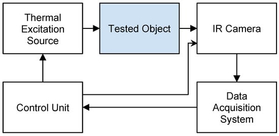 The general measurement concept for Active Dynamic Thermography (ADT), Thermal Tomography (TT), and Thermographic Signal Reconstruction (TSR) or Phase Pulse Thermography (with a sinusoidal type of excitation) is illustrated in Figure 3. The process involves the following steps: In initial temperature registration, the steady-state temperature distribution of the tested surface (ROI) is recorded using an infrared (IR) camera. Next, a controlled thermal excitation (heating or cooling) is applied to the ROI. Temperature transients at the ROI surface are recorded, particularly during the recovery phase after the excitation is switched off. An external thermal excitation source operates under fully controlled conditions. A control unit synchronizes the excitation process with temperature registration to ensure precise data capture. Data collection and analysis are the final steps. For pulsed excitation, diagnostic measurements focus on the recovery phase to the initial conditions. All temperature data are stored in the data acquisition system for subsequent computer analysis and determination of model parameters. This process ensures accurate and reproducible thermal measurements for diagnostic purposes.