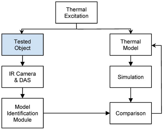 Thermal Tomography presents additional complexity, as it involves reconstructing the dimensions and material properties of 3D structural thermal models. The typical procedure for reconstructing model parameters is shown in Figure 4. It includes the following steps: In thermal excitation, a controlled thermal excitation (physical or simulated) is applied to the tested structure and its corresponding thermal model simultaneously. Next, temperature transients on the object’s surface are recorded using an infrared (IR) camera. In parallel, the same thermal excitation process is simulated for the thermal model. For each pixel, the recorded temperature time course is identified and compared with the simulated transient. If discrepancies exist between the measured and simulated results, the thermal model is modified iteratively. Adjustments continue until the simulation results converge with the experimental data. The final step is model validation. Once the simulation and measurement results are convergent, the reconstruction procedure is complete. At this stage, the model is considered to represent the tested structure with a high degree of confidence. This iterative and precise process ensures that the reconstructed thermal model accurately reflects the physical properties and behavior of the tested structure.