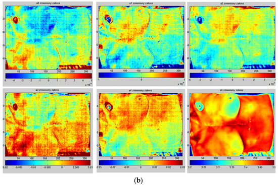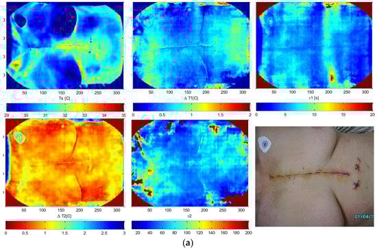 The most commonly reconstructed parameters are those associated with the equivalent exponential Equations (2) and (3). These parameters include the following: steady state temperature component Ts(x,y) = T(x,y,0); delta coefficients (Δ), representing the increases or decreases in temperature T over time; thermal time constants, characterizing the temporal response of the tissue to thermal changes. These parameters allow the quantitative description of the examined tissue using time constants and exponential terms, providing valuable insights into its thermal and physiological properties. We assume the following equations: