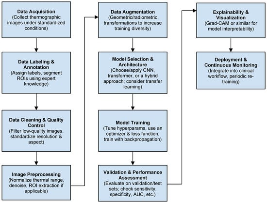 - Wang, X.; Chou, K.; Zhang, G.; Zuo, Z.; Zhang, T.; Zhou, Y.; Mao, F.; Lin, Y.; Shen, S.; Zhang, X.; et al. Breast cancer pre-clinical screening using infrared thermography and artificial intelligence: A prospective, multicentre, diagnostic accuracy cohort study. Int. J. Surg. 2023, 109, 3021–3031. [Google Scholar] [CrossRef]