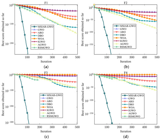 In order to examine the optimization-seeking performance of the MSIAR-GWO algorithm proposed in this paper, it is compared with other common swarm intelligence optimization algorithms such as the original gray wolf optimization algorithm (GWO), the artificial rabbit optimization algorithm (ARO), the dung beetle optimization algorithm (DBO), and the whale optimization algorithm (WOA), as well as with a series of other gray wolf optimization algorithms based on the gray wolf optimization algorithm such as the IGWO, the AGWO, the RSMGWO, and other improved algorithms. In addition, simulation experiments are conducted on 18 standard test functions, among which, F1–F7 shown in Table 1 are single-peak benchmark test functions for examining the convergence speed and accuracy of the algorithms; the multi-peak benchmark test functions F8–F13 in Table 2 and the fixed-dimension multi-peak benchmark test functions F14–F18 in Table 3 are used to examine the exploration ability of the algorithms and their ability to avoid falling into the local optimum. In order to ensure the fairness of the simulation experiments, the maximum number of iterations of all algorithms is set to 500, and the number of populations is set to 30. In order to eliminate the influence of randomness, all the experiments of the above algorithms are executed separately 20 times; and the optimal value, average value, worst value, and standard deviation of each algorithm are calculated; the final evaluation of the searching accuracy is made by the average value; and the standard deviation is evaluated by the stability performance. All tests were performed using the following hardware and software environments: 12th Gen Intel(R) Core(TM) i5-12600KF CPU, 370 GHz, 10 cores, 16 logical processors; 32 GB RAM; NVIDIA GeForce RTX 4080 Laptop GPU; Microsoft Windows 11 operating system; Matlab; and NVIDIA GeForce RTX 4080 Laptop GPU; Windows 11 operating system; Matlab 2021a programming software.