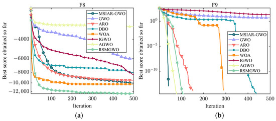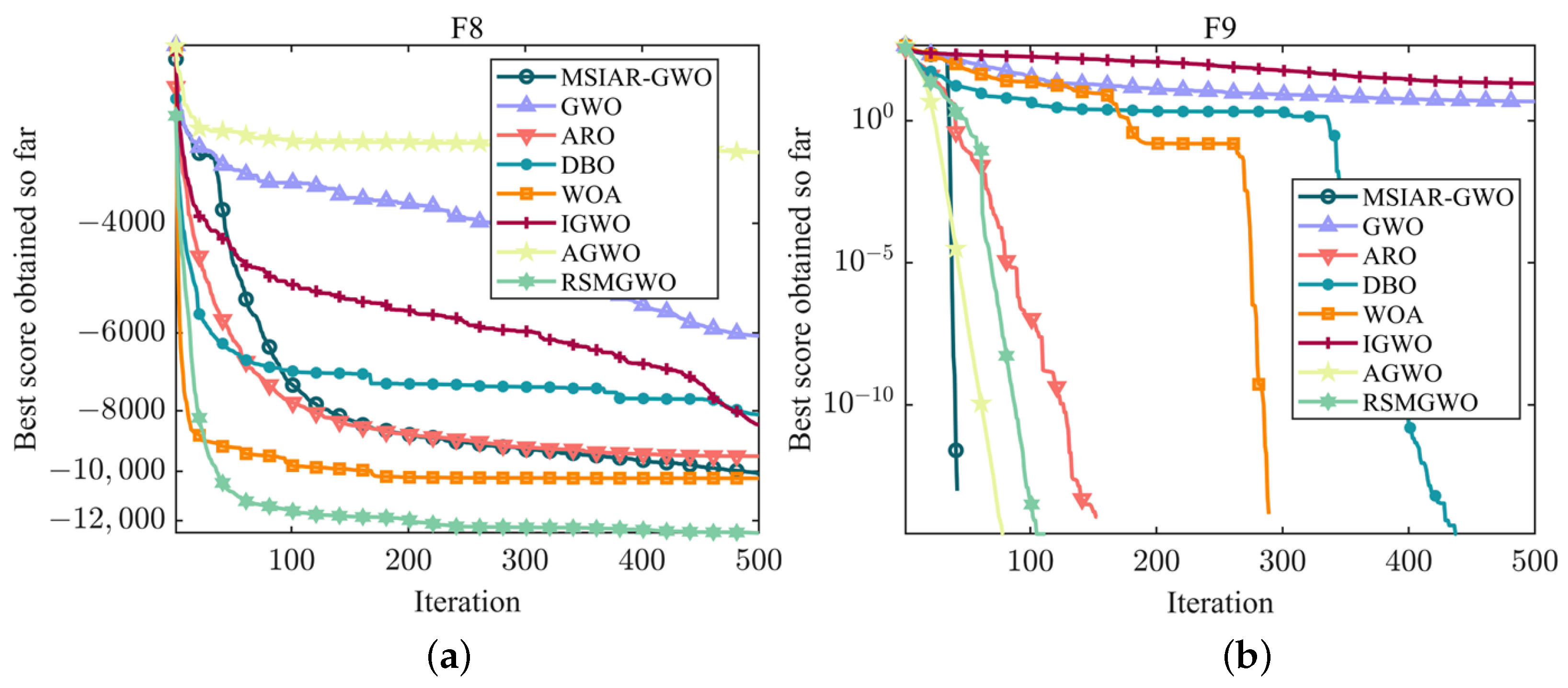 F8–F13 as multi-peak test functions have many local optimal solutions in the search space and thus can be a good test of an algorithm’s ability to solve complex problems. As shown in Table 5, Although MSIAR-GWO fails to achieve the best result in F8, its optimization result is only after RSMGWO and WOA; its optimization ability is in third place, and the algorithms AGWO, ARO, RSMGWO, and MSIAR-GWO can finally converge to the theoretical minimum in F9; ARO, DBO, WOA, AGWO, RSMGWO and MSIAR-GWO algorithms can also converge to the theoretical optimal value in F11; the convergence accuracy of ARO, DBO and MSIAR-GWO algorithms in F10 is the same. Although there are other algorithms in F9, F10, and F11 that have the same convergence accuracy as the MSIAR-GWO algorithm and finally converge to the same solution, it can be seen in Figure 7b–d that compared with the traditional GWO, which once it falls into the local optimum finds it difficult to escape, leading to premature convergence, the MSIAR-GWO finds the theoretically optimal solution in less than 50 iterations, and the convergence speed is much faster than other algorithms under the same conditions. In the benchmark test functions F12 and F13, our method MSIAR-GWO shows an absolute advantage over other classical optimization algorithms and other improved gray wolf optimization algorithms with all the statistical data. For the multi-peak test functions, it is demonstrated through simulation experiments that the MSIAR-GWO algorithm, by incorporating an adaptive position-updating strategy based on detour foraging and dynamic weights as well as a stochastic center-of-gravity dynamic reverse learning elimination and relocation strategy, increases the diversity of the population while guaranteeing the quality of the elite individuals in the process of population evolution, significantly reduces the risk of falling into a local optimum, and improves the search ability of the algorithm.