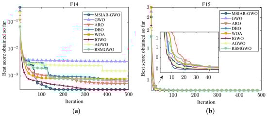 F14–F18 are fixed-dimension multi-peak benchmark functions whose peaks’ number and position remain stable throughout the search process, which helps to more accurately evaluate the performance of the algorithms in dealing with the stable multi-modal structure problem. MSIAR-GWO, ARO, DBO, and IGWO all eventually converge to the same minimum in F14, but the average value of IGWO is slightly better than that of the MSIAR-GWO algorithm, and MSIAR-GWO has the second best optimization-finding ability compared to the other algorithms. Although the optimal values of all algorithms in F15 and F16 finally converge to close to the theoretical minimum, it can be found in Table 6 that MSIAR-GWO, ARO, DBO, and IGWO converge to the minimum value in each of the 20 individual tests in F15 and therefore achieve the smallest standard deviation and have a strong robustness. There is a large gap between the maximum and minimum values of WOA and AGWO in F16 indicates that these two algorithms are more likely to have difficulty escaping from falling into a local optimum during the optimization search process. In F18, the convergence accuracies of MSIAR-GWO and IGWO are higher than the other comparison algorithms, but by comparing the standard deviation evaluation indexes, it can be found that the MSIAR-GWO algorithm has an absolute advantage. As shown in Figure 8, Although most of the algorithms can find optimal solutions similar to the theoretical optimum on the fixed-dimension multi-peak benchmark test functions and there is not much difference in the ability to obtain the optimal results, MSIAR-GWO shows more stable search performance.