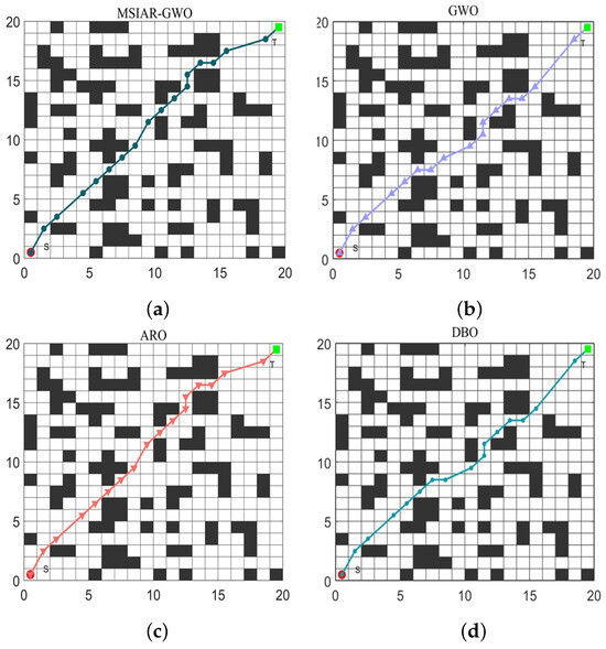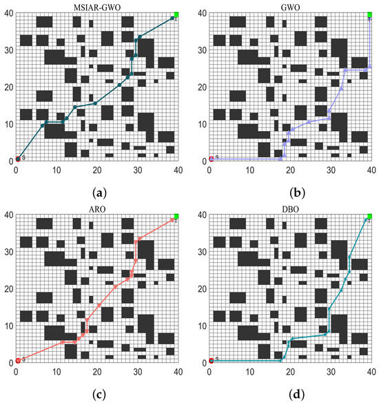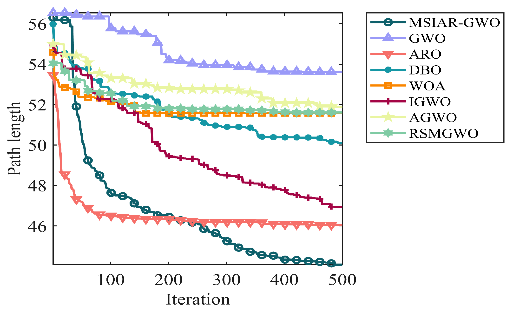 The traditional graph search path planning algorithm based on a grid map has high efficiency in dealing with simple environments, but its efficiency and global optimization ability is limited in complex environments, such as dense obstacles and multiple path choices. Compared with the traditional A* algorithm through simulation experiments, the results in Table 8 and Figure 11 show that the optimal path length of the MSIAR-GWO algorithm is reduced by 4.22% and 2.54%, respectively, compared with that of the A* algorithm under the 20 × 20 and 40 × 40 grid maps, indicating that the MSIAR-GWO algorithm is competitive in solving the shortest path problem. In particular, it shows stronger global optimization ability in a complex environment.