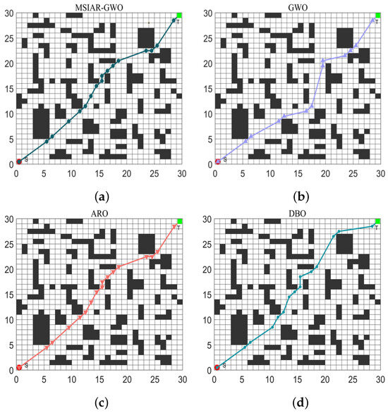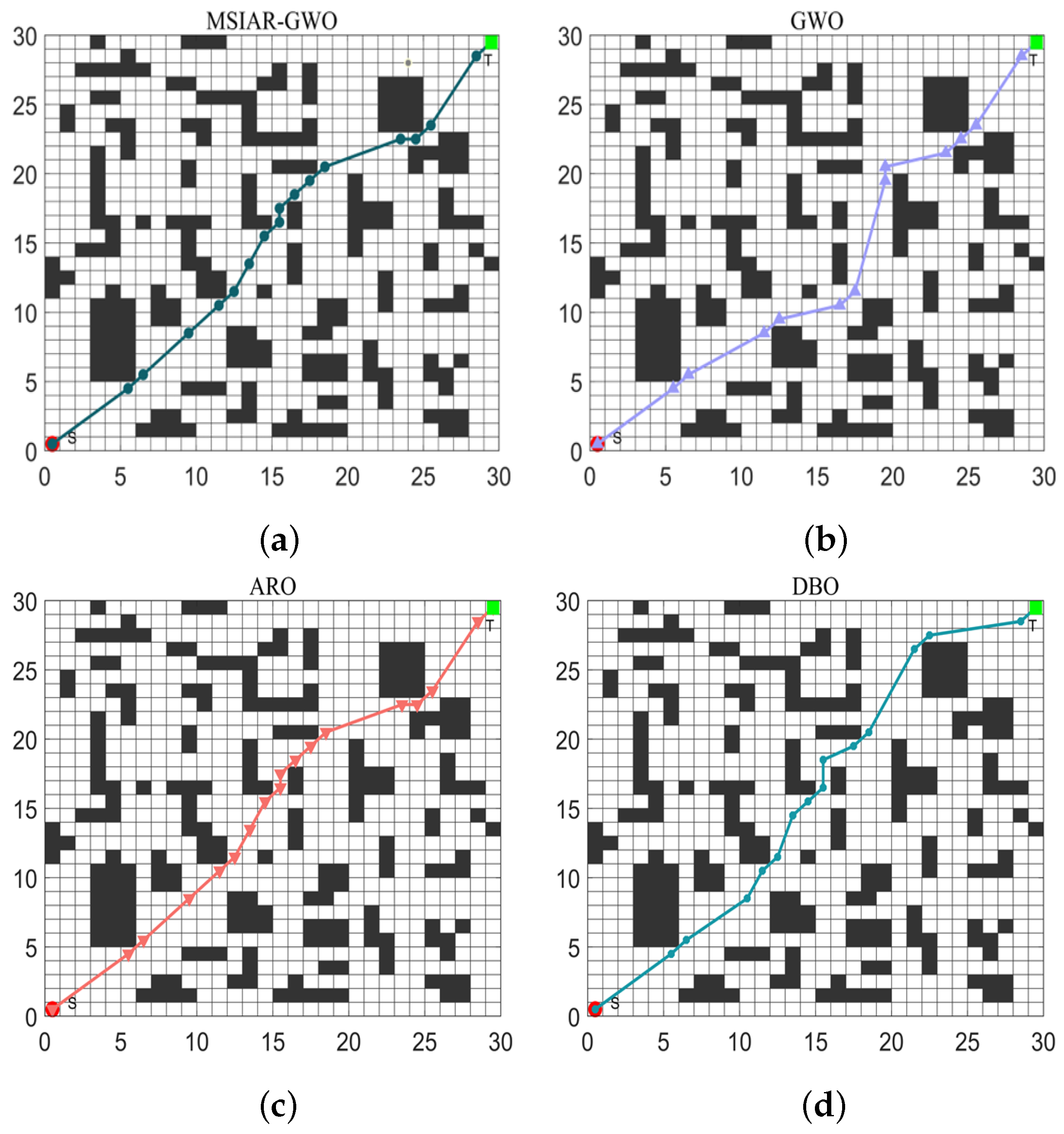 Finally, the fitness function as shown in Equation (32) is constructed to calculate the fitness value of the individual path of the gray wolf and update the path shortest length and path shortest planning information, which are used as the objective function to be optimized by the algorithm to evaluate the optimization ability of the algorithm in path planning. The MSIAR-GWO algorithm is used to optimize the fitness function and find the shortest path.