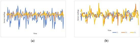 Despite great progress, current HAR still faces two critical challenges that prevent us from building a generalizable model to perform well on unseen data. First, compared to the image domain, annotating time-series data often requires prior knowledge of each time segment [9], significantly increasing the cost of acquiring training data. Second, as shown in Figure 1 and Figure 2, datasets from different individuals may exhibit different distributions in both the time domain and the frequency domain, which may further worsen the challenge of generalization. Figure 1 represents the accelerometer sensor signal during the activity of running from the DSADS [10] dataset, and Figure 2 represents the spectral representation of the corresponding sensor signal. Specifically, the first subgraph in Figure 1 illustrates how the sensor data distribution changes over time for the same individual performing the same activity, while the second subgraph in Figure 1 highlights the differences in sensor data distribution among different individuals engaged in the same activity. When training data are insufficient, the model’s generalization ability may be limited [11,12]. To alleviate the negative impact of these factors on model generalization, research on DA and Domain Generalization(DG) in HAR has acquired significant attention in recent years [13]. DA aims to adapt a model from its original domain to another domain. Models are trained using data from the source domain and then fine-tuned on the target domain to better adapt to the data distribution of the target domain. Techniques commonly used in DA include feature alignment and adaptive training methods. However, DA typically requires access to target data during the training phase, which is often impractical in real-world applications, posing a major challenge to improving model generalization capability. On the other hand, DG focuses on improving the model’s ability to generalize to different but related domains, without relying on domain-specific knowledge. The objective of DG is to train models to exhibit robustness to variations in data distribution encountered during the training process, thereby empowering them to generalize effectively to unobserved domains.