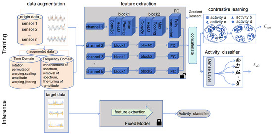 When the distributions of various activities are expanded through data augmentation techniques, the feature vectors representing each activity in the feature space become denser. This increased density poses challenges for training classification models. Therefore, improving the discriminative capacity of activities within the feature space becomes necessary to maintain the model’s generalization ability. To address this issue, we propose the adoption of contrastive learning.