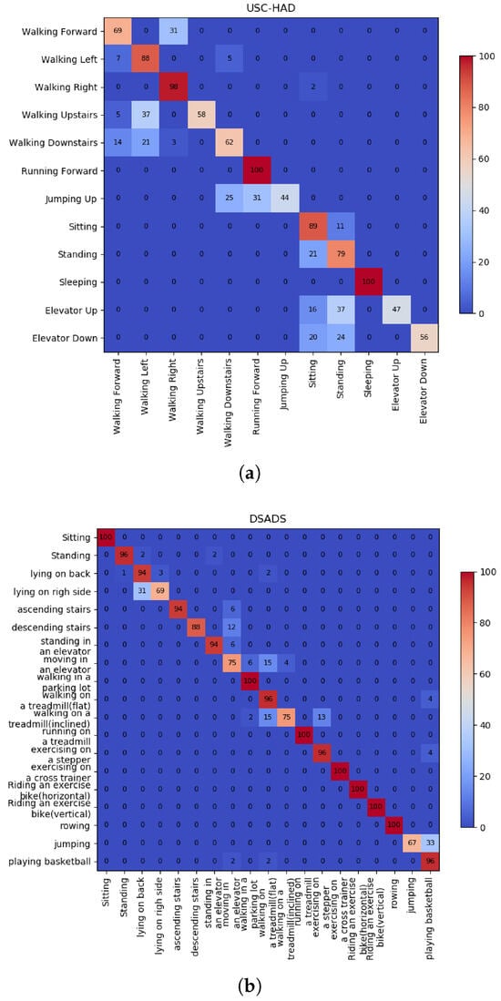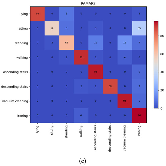 (a) Confusion matrix of dataset USC-HAD. (b) Confusion matrix of dataset DSADS. (c) Confusion matrix of dataset PAMAP2.