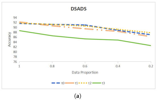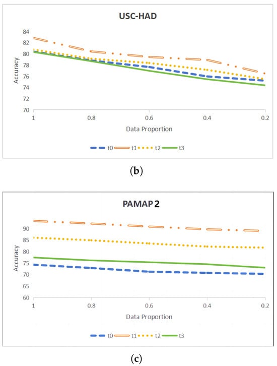 (a) A line graph showing the change in classification accuracy of DSADS dataset when the training data volume changes. (b) A line graph showing the change in classification accuracy of USC-HAD dataset when the training data volume changes. (c) A line graph showing the change in classification accuracy of PAMAP2 dataset when the training data volume changes.