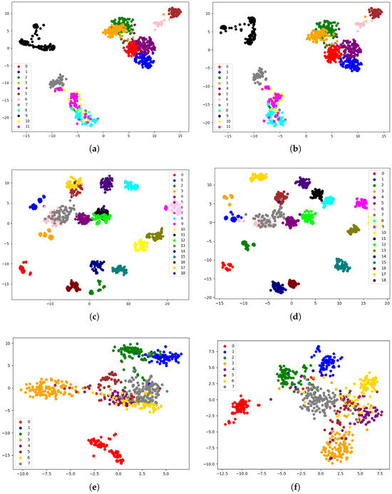 (a) This plot depicts the t-SNE visualization of DDLearn on the USC-HAD dataset. (b) This plot depicts the t-SNE visualization of CLEAR on the USC-HAD dataset. (c) This plot depicts the t-SNE visualization of DDLearn on the DSADS dataset. (d) This plot depicts the t-SNE visualization of CLEAR on the DSADS dataset. (e) This plot depicts the t-SNE visualization of DDLearn on the PAMAP2 dataset. (f) This plot depicts the t-SNE visualization of CLEAR on the PAMAP2 dataset.