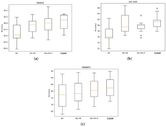 We employed a contrastive learning module to address this issue, aiming to reduce intra-class distance and increase inter-class margin to improve feature distinguishability. As depicted in Figure 7, the median lines of the boxplots across all three datasets showed significant improvement. In the DSADS, while the upper quartile of the boxplot decreased compared to before, both the lower whisker and Q1 exhibited noticeable improvement. This suggests improved model performance in various scenarios, with higher average accuracy and stability despite the decrease in the upper limit. In the USC-HAD, the box became smaller, further affirming the model’s stability. Although a few outliers are present, they lie above the upper quartile, thus not adversely impacting the model’s average accuracy.