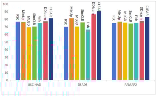 For each test domain, we conducted three sets of experiments and calculated the statistical metrics, which are presented in Table 2. The normalized confusion matrixes are illustrated in Figure 4. The experimental results demonstrate that CLEAR achieves average accuracy rates of 82.75%, 90.45%, and 81.09% on the PAMAP2, USC-HAD and DSADS datasets, respectively. In these datasets, CLEAR achieved precision rates of 85.50%, 84.48%, and 91.57%, respectively, indicating high accuracy in predicting positive instances. Correspondingly, the recall rates for CLEAR on these datasets were 82.25%, 79.88%, and 91.13%, indicating the successful identification of the majority of true positive samples. Additionally, the F-measure values for CLEAR were 82.25%, 79.88%, and 91.13% across the three datasets, indicating a good balance between precision and recall, demonstrating the model’s ability to perform well while maintaining both accuracy and recall. Based on the results, it is evident that under the multi-angle data augmentation strategy, the model’s generalization ability towards the unknown dataset has improved. Additionally, the feature fusion and contrastive learning components enable the model to capture more effective and discriminative features. Eventually, this results in high accuracy on the test set.
