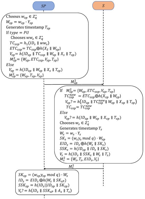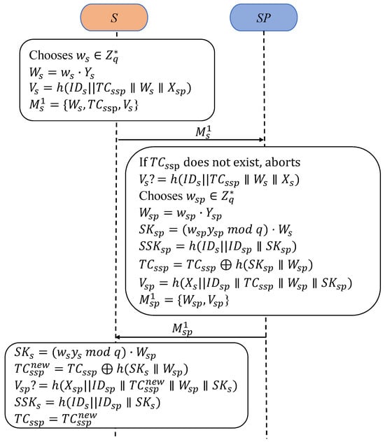 After registration, the end device S receives its long-term private key . Only the TA generates the partial key , ensuring that there is no key escrow problem. The process for the SP is analogous.