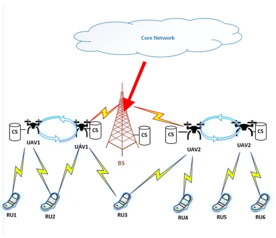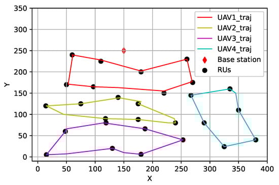 Figure 5. It is seen that the four UAVs fly in close proximity to the RUs they are serving and hover above each of them. Under the constraints of content fetching, we can observe from the figure that one UAV can serve multiple RUs, and one RU can be served only by one UAV.