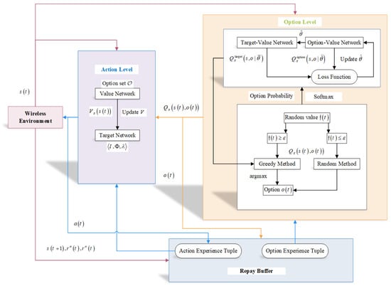 Figure 3. As can be observed, the proposed OHDRL includes two parts: one for options and the other for actions. Each part relies on two fully connected DNNs to stabilize the learning.