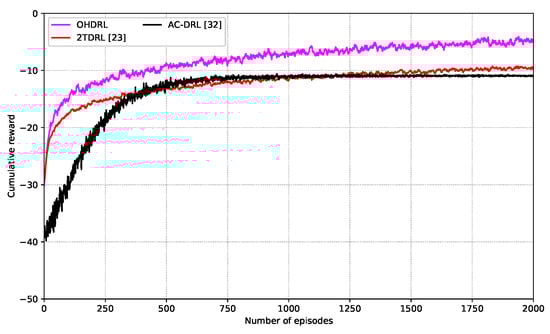 Note that to conduct the proposed OHDRL, we need to initialize the DNNs and replay buffers and then perform two rounds of iterations in various episodes and steps. The complexity analysis of the proposed algorithm can be analyzed below. Let denote the time consumed for DNN initialization, let denote the time required to initialize the replay buffer in each episode, and let represent the time consumed for computation operations in each step. In addition, we denote and as the number of training episodes and steps, respectively. The total time complexity of the OHDRL algorithm can be expressed as .
