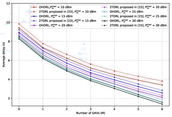 23]. We set the maximum transmit power of the UAVs as 10 dBm, 15 dBm, 20 dBm, 35 dBm, and 30 dBm. The figure shows that the average delay decreases as the number of UAVs increases. This is due to the possibility that more UAVs may cooperate to serve the RUs, which reduces the average delay. We can also observe that for different maximum transmit powers of the UAVs, the highest maximum transmit power results in better performance. The reason is that a higher maximum transmit power offers more flexibility in selecting the optimal power, thus resulting in a smaller delay. By contrasting the results obtained from our proposed algorithm with the one proposed in [