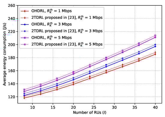 Figure 8 illustrates the energy consumption performance of the proposed OHDRL-based algorithm under different numbers of RUs and rate requirements (
