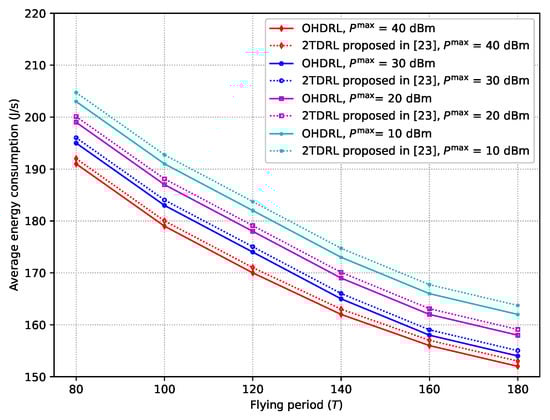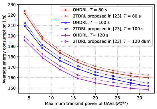 23]. The graphic shows that while the flying time increases, the average energy consumption decreases. This reduction is due to the ability of UAVs to optimize their flight trajectories over a longer period. With more time, the UAVs can plan more energy-efficient routes, which reduces the need for abrupt adjustments or inefficient flight paths. The extended flying period allows for smoother, more gradual maneuvers, reducing the overall energy required for propulsion and improving task completion efficiency. In addition, the figure illustrates that an increase in the maximum BS transmit power results in a decrease in the overall energy consumption. This occurs because a higher transmit power ensures that data can be transmitted with greater efficiency, reducing the need for the UAVs to expend additional energy compensating for weak or fluctuating signals. With a stronger signal, the UAVs experience fewer communication failures and retransmissions, which, in turn, minimizes the energy required for flight path adjustments and maintains the link. By comparing the results obtained from the proposed OHDRL and 2TDRL in [