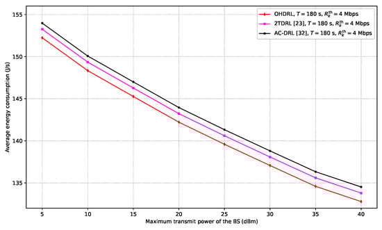 Mbit/s. The results show that the average energy consumption of the OHDRL, 2TDRL, and AC-DRL frameworks decreases as the maximum transmit power of the BS increases, indicating their ability to optimize resource allocation under a higher maximum transmit power. This is because higher transmit power may enable the system to operate at lower transmission rates or fewer required transmission periods, thus contributing to a reduction in energy consumption. Additionally, as shown, OHDRL achieves the lowest average energy consumption across all