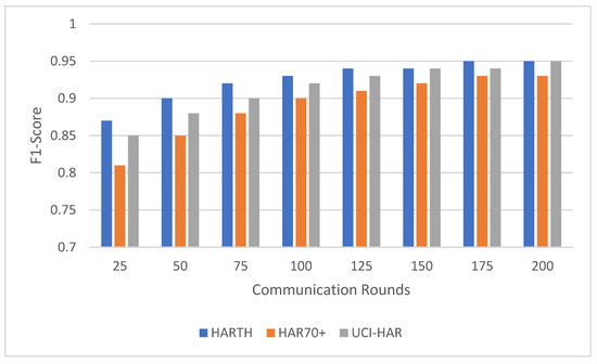 The minimum and maximum values provide a range for the accuracy and F1-scores across communication rounds, reflecting the model’s performance fluctuations. For instance, the HARTH dataset had a minimum accuracy of 87.1% and a maximum accuracy of 91.7%, showing that even the lowest recorded accuracy was relatively high. In contrast, HAR70+ had a wider range, with a minimum accuracy of 85.0% and a maximum of 89.5%, indicating more pronounced variations across communication rounds. The UCI-HAR dataset had a narrow range, with a minimum accuracy of 88.5% and a maximum of 92.0%, demonstrating its consistent performance across all rounds.
