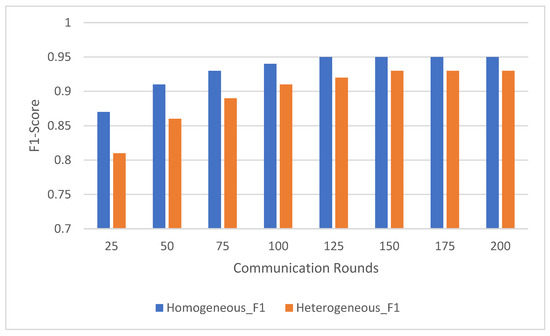 The trends in F1-score, depicted in Figure 6, mirrored those observed for accuracy. In the homogeneous distribution, the F1-score began at 0.87 ± 0.03 after 25 rounds and consistently improved to 0.95 ± 0.02 after 200 rounds. The steady increase highlights the model’s ability to balance precision and recall effectively across all classes, aided by the even representation of activities across clients.
