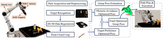 In terms of algorithmic principles, grasping solutions can be categorized into model-based and model-free approaches [9]. The former involves high maintenance costs [10,11], while the latter is more flexible but faces challenges in generalization [12,13]. Parallel computing has facilitated the application of deep learning in grasp detection [14], where the use of RGB-D sensors in conjunction with neural networks such as CNN and PointNet has enhanced the accuracy of grasp prediction [15,16,17,18]. However, methods like GPD and PointNet face high data dependency and computational demands, limiting their industrial applications [19,20,21,22,23]. Current methods achieve success rates of 75–95% under controlled conditions; however, this rate is insufficient for dealing with clutter and occlusion in real-world scenarios [7,19,24,25,26]. Improving the robustness and adaptability of algorithms remains a key challenge [27,28,29].