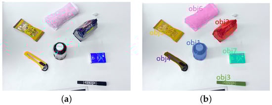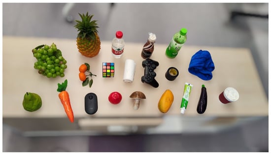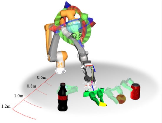 Various common objects with different scales and shapes, including a pen, a banana, a mobile phone, an apple, a soda can, and a game controller, were selected as grasping targets. These objects were randomly placed on a table within the testing environment and tested at three different horizontal distances from the robotic arm’s origin, 0.6–0.8 m (), 0.8–1.0 m (), and 1.0–1.2 m (), which were used as the first control variable. The experimental setup is shown in Figure 8.
