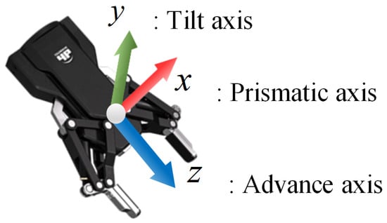This section outlines the method for estimating the grasp pose, as introduced in Section 2.2. The coordinate system of the robotic arm is illustrated in Figure 3. The prismatic axis defines the gripper’s movement, the tilt axis indicates the pitch angle, and the advance axis, derived from the cross product of the prismatic and tilt axes, defines the direction of gripper extension.