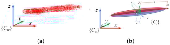 Ellipsoidal modeling of grasping target: (a) point cloud representation; (b) transformation matrix and axis lengths.
